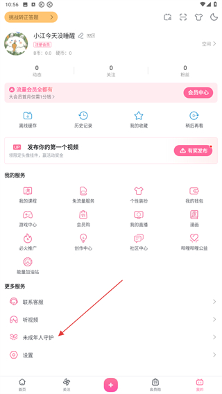 2、進(jìn)入個(gè)人中心的界面內(nèi),點(diǎn)擊下方未成年人守護(hù)的按鈕。