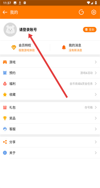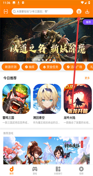 1、在游戲平臺首頁點擊右上角個人圖標,進入“我的”頁面。