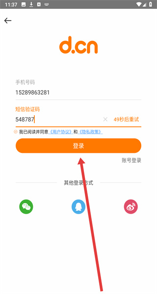 4、輸入短信驗證碼后,點擊“登錄”按鈕,完成賬號登錄。