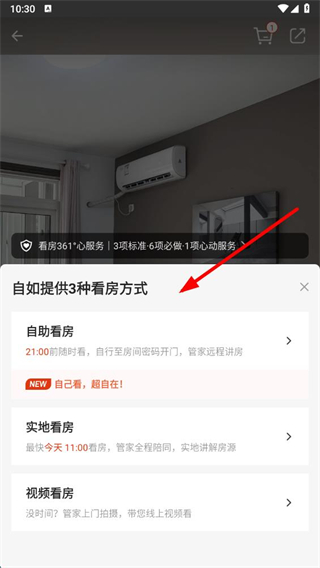 3、在看房方式選擇菜單中選擇看房方式,以自助看房為例,進入看房時間選擇頁面。