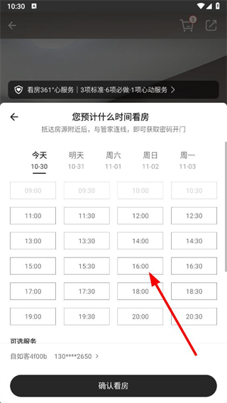 4、在看房時間選擇頁面選擇預計看房時間,點擊確認看房按鈕,即可完成看房預約。