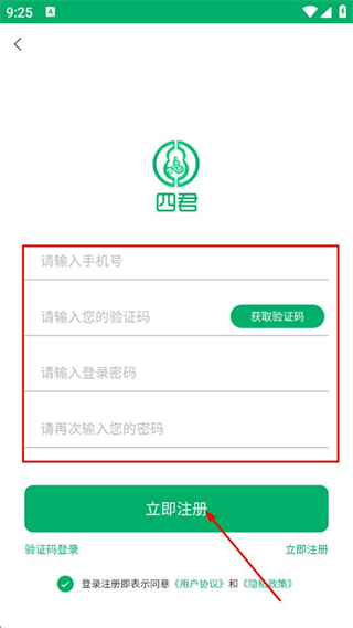 4、填寫手機(jī)號(hào)、驗(yàn)證碼、登錄密碼并再次確認(rèn)密碼后,點(diǎn)擊立即注冊(cè)。