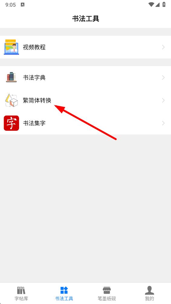 2、在書(shū)法工具界面,找到并點(diǎn)擊繁簡(jiǎn)體轉(zhuǎn)換選項(xiàng),進(jìn)入繁簡(jiǎn)體轉(zhuǎn)換頁(yè)面。