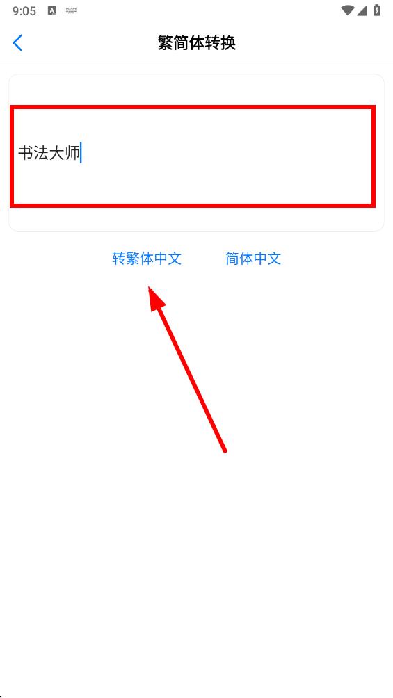 3、在繁簡(jiǎn)體轉(zhuǎn)換頁(yè)面的輸入框中,輸入要轉(zhuǎn)換的文字,如書(shū)法大師,然后點(diǎn)擊轉(zhuǎn)繁體中文。