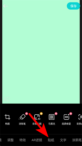 4、在修圖頁面點(diǎn)擊貼紙,選擇喜歡的貼紙進(jìn)行添加,完成后點(diǎn)擊保存即可。
