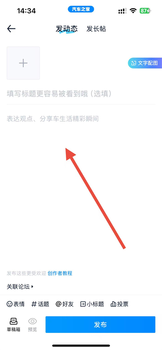 3、在發(fā)動(dòng)態(tài)頁(yè)面添加圖片、填寫標(biāo)題和內(nèi)容,還可添加話題、@好友等。