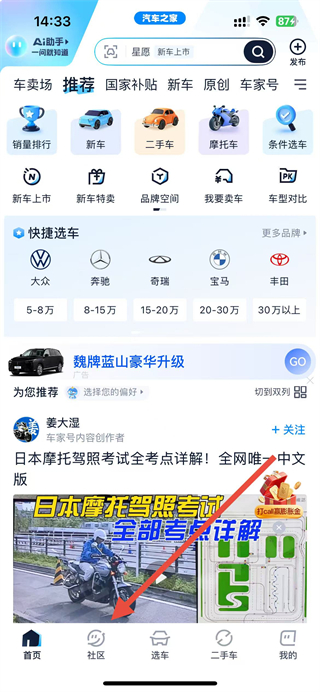 1、在汽車之家app首頁(yè)點(diǎn)擊社區(qū)選項(xiàng),進(jìn)入社區(qū)頁(yè)面。