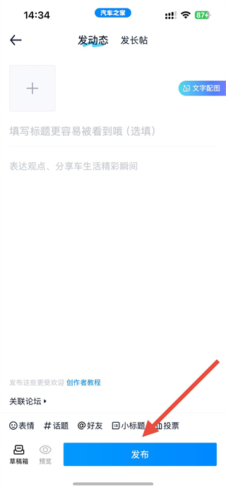 2、在社區(qū)頁(yè)面點(diǎn)擊發(fā)布按鈕,進(jìn)入發(fā)動(dòng)態(tài)頁(yè)面。