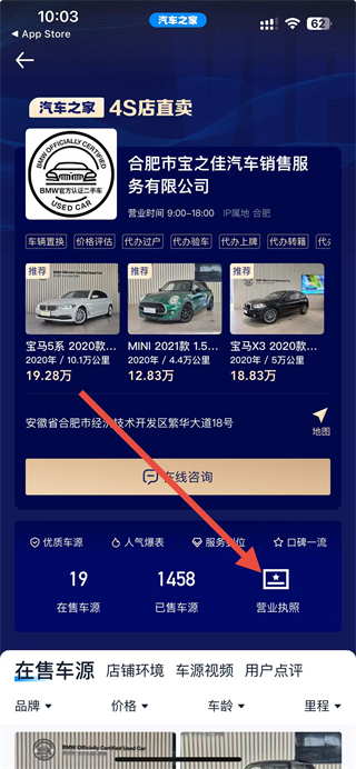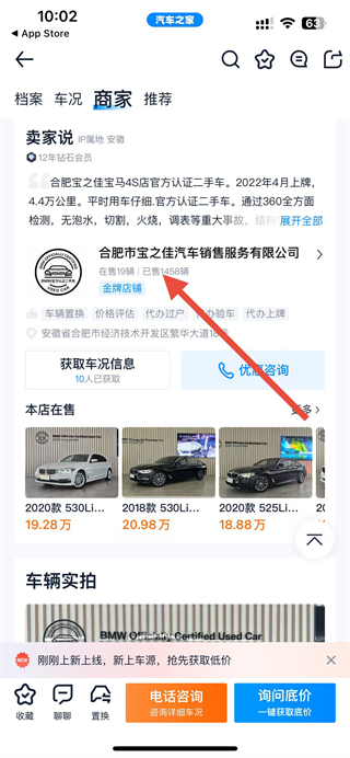 2、在車輛詳情頁(yè)下滑點(diǎn)擊店鋪名稱,進(jìn)入店鋪詳情頁(yè)。