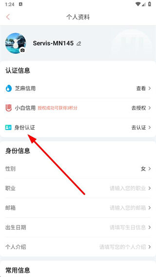 3、在個(gè)人資料頁(yè)面點(diǎn)擊身份認(rèn)證選項(xiàng),進(jìn)入身份認(rèn)證頁(yè)面。