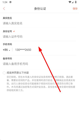 4、在身份認(rèn)證頁(yè)面輸入信息,勾選同意協(xié)議后點(diǎn)擊保存按鈕,即可完成身份認(rèn)證操作。