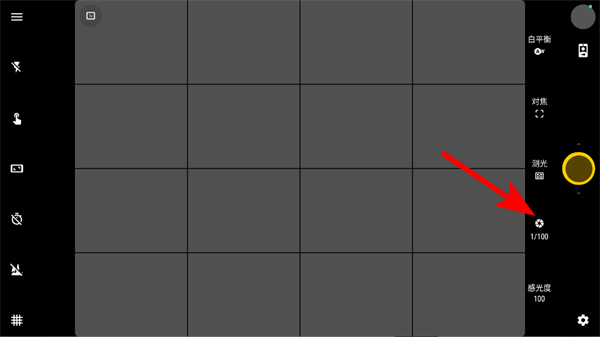 1、打開CameraFV5應用,點擊右側(cè)的1/100快門選項。