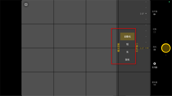 2、在彈出的菜單中,選擇自動化、短、長、加長等曝光控制模式。