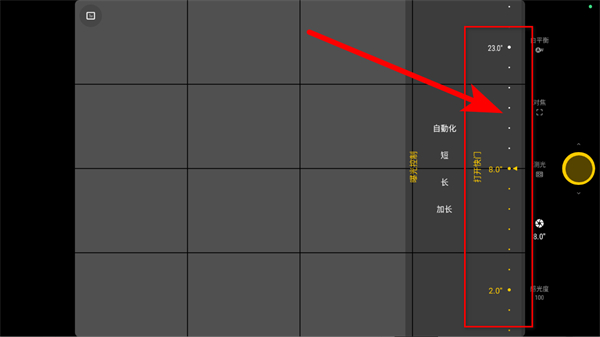 3、在打開快門欄中,滑動調(diào)整快門時長如從2.0調(diào)整至23.0。