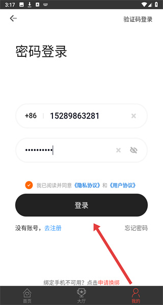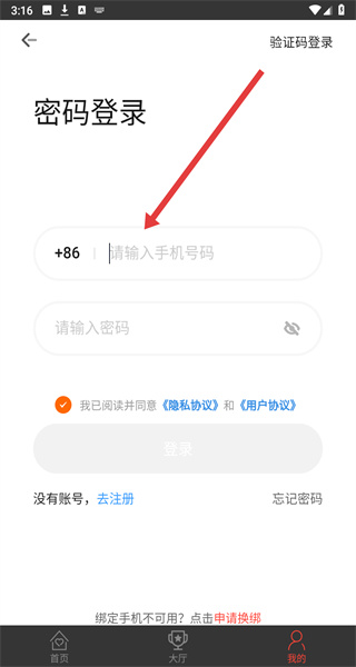 3、進(jìn)入到密碼登錄頁(yè),點(diǎn)擊輸入框輸入手機(jī)號(hào)碼信息。