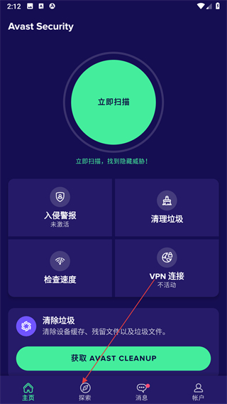 1、打開Avast Mobile Security應用,點擊探索選項,進入探索頁面。