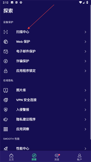 2、在探索頁面,點擊掃描中心選項,進入掃描中心頁面。
