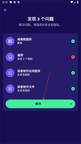 4、掃描完成后,若發(fā)現(xiàn)問題,點擊解決按鈕,即可處理安全威脅。
