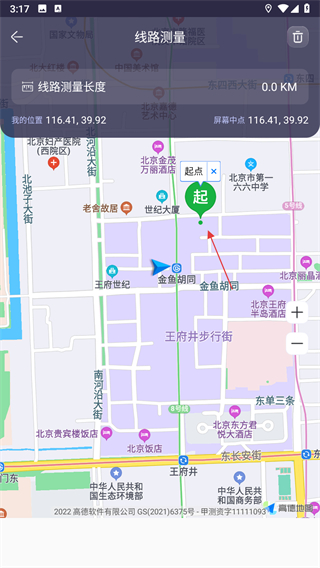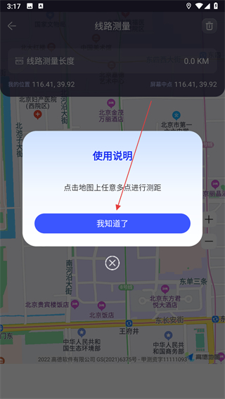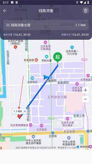4、繼續(xù)在地圖上點(diǎn)擊選擇終點(diǎn)位置,即可查看線路測(cè)量長(zhǎng)度。