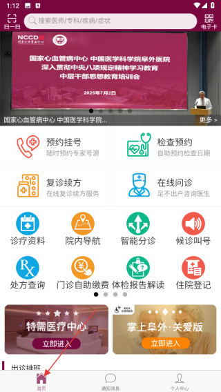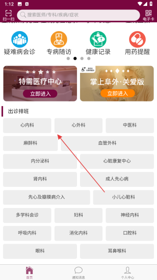 2、下滑首頁(yè),查看出診排班,選擇心內(nèi)科心外科等科室,了解出診信息,使用疑難病會(huì)診專病隨訪等服務(wù),管理健康記錄用藥提醒,獲取精準(zhǔn)醫(yī)療服務(wù)。