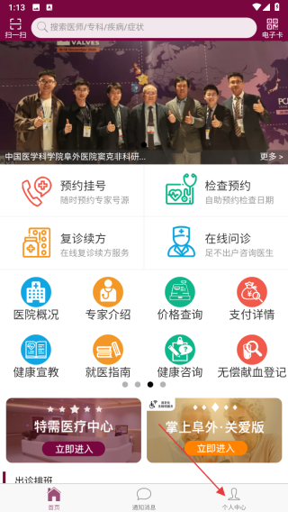 3、切換至個(gè)人中心頁(yè)面,查詢醫(yī)院概況專家介紹等信息,進(jìn)行價(jià)格查詢支付詳情操作,參與健康宣教就醫(yī)指南,完成健康咨詢無(wú)償獻(xiàn)血登記,管理個(gè)人就醫(yī)事務(wù)。