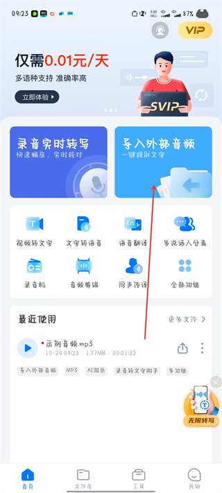 1、打開錄音轉(zhuǎn)文字助手應(yīng)用,點(diǎn)擊導(dǎo)入外部音頻選項(xiàng)。