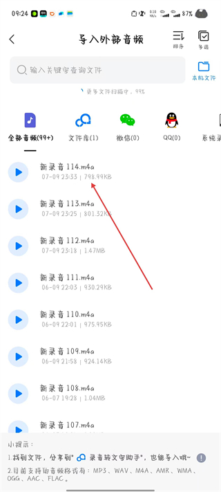 3、進(jìn)入導(dǎo)入外部音頻頁(yè)面后,選擇需要轉(zhuǎn)文字的音頻文件。