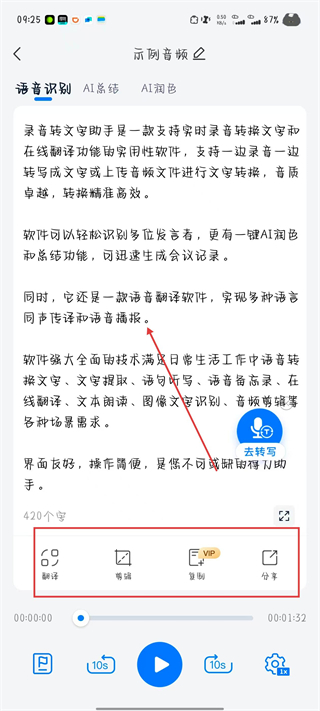 4、音頻轉(zhuǎn)文字完成后,可進(jìn)行翻譯、剪輯、復(fù)制、分享等操作。