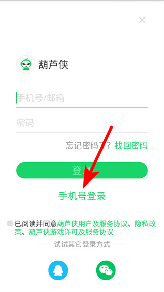 3、在登錄界面,點擊手機號登錄選項,進入手機號填寫頁面。