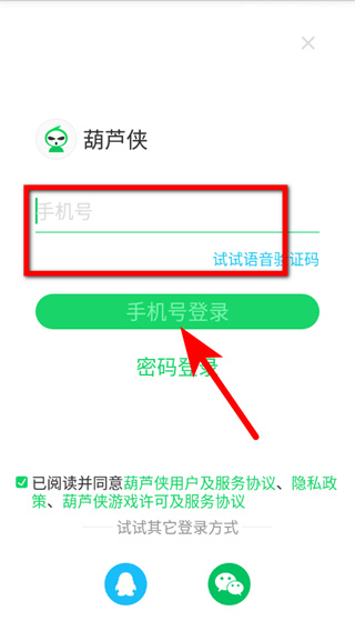 4、在勾選好同意按鈕時,可點擊上方輸入框,依次輸入手機號和密碼信息后即可完成登錄操作。