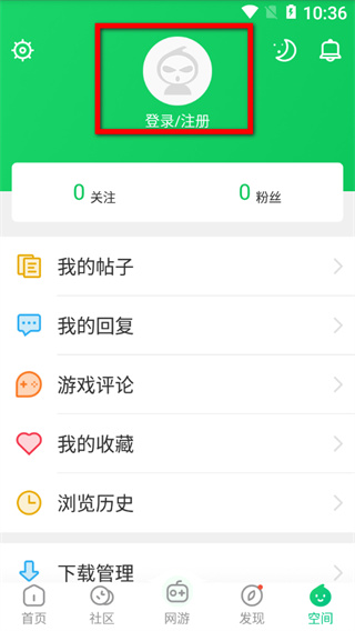 2、在個人空間頁面,點擊登錄/注冊按鈕,進入登錄界面。