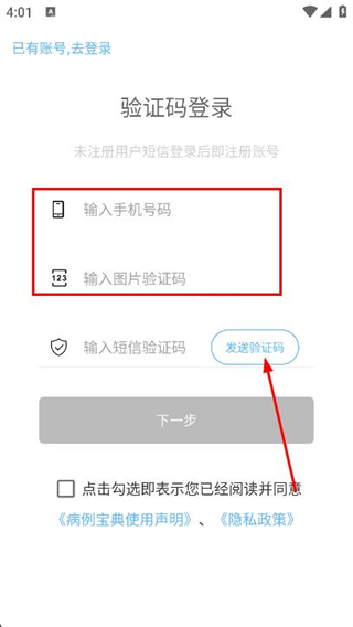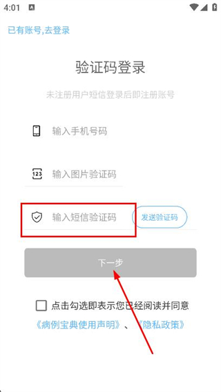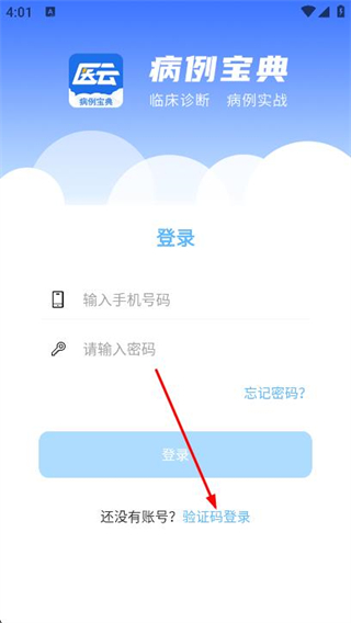 1、打開病例寶典app,找到并點擊下方的驗證碼登錄選項。