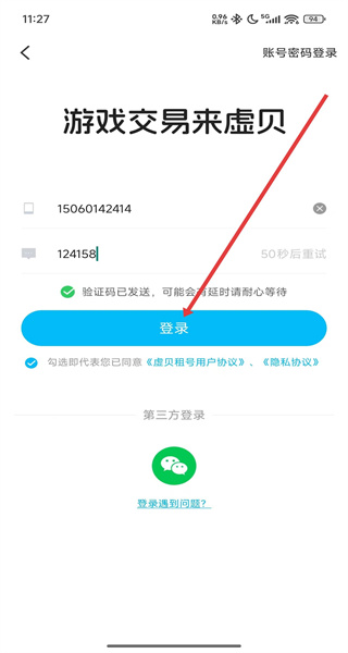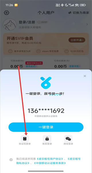 4、填入收到的驗證碼,勾選同意相關(guān)協(xié)議,點擊“登錄”按鈕,完成虛貝APP登錄。