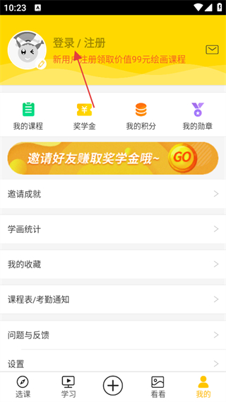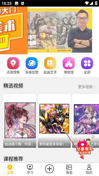 1、打開(kāi)天天畫(huà)APP,進(jìn)入首頁(yè)后,點(diǎn)擊底部導(dǎo)航欄中的我的選項(xiàng)。