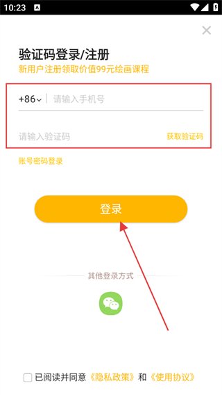 3、輸入手機(jī)號(hào)、驗(yàn)證碼,勾選同意隱私政策和使用協(xié)議,點(diǎn)擊登錄,完成賬號(hào)注冊(cè)。