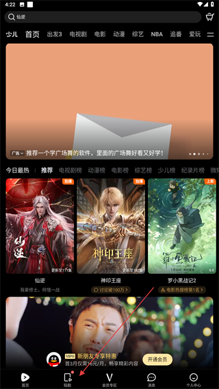 1、啟動(dòng)騰訊視頻的應(yīng)用,進(jìn)入首頁(yè)點(diǎn)擊下方短劇的標(biāo)簽。