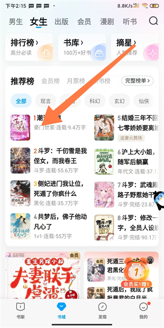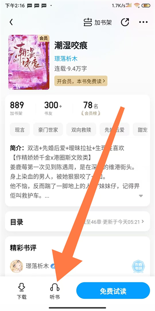1、在QQ閱讀書(shū)城頁(yè)面,點(diǎn)擊要聽(tīng)的書(shū)籍,如潮濕咬痕,進(jìn)入書(shū)籍詳情頁(yè)面。