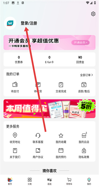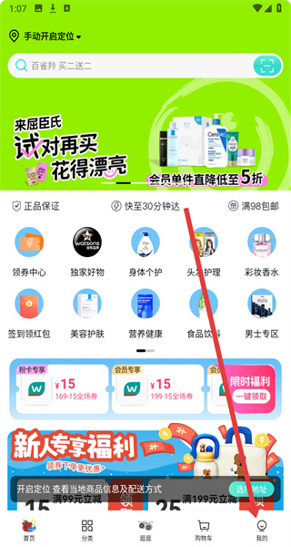 1、打開屈臣氏app進(jìn)入首頁后,點(diǎn)擊底部導(dǎo)航欄最右側(cè)我的圖標(biāo)進(jìn)入個(gè)人頁面。