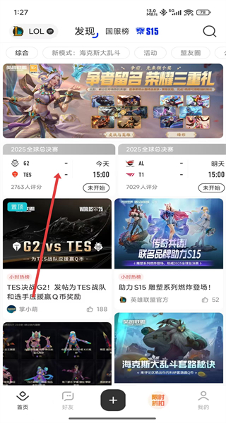 4、授權(quán)登錄完成后,進(jìn)入掌上英雄聯(lián)盟的發(fā)現(xiàn)頁面,可以點(diǎn)擊賽事進(jìn)入查看相關(guān)信息。