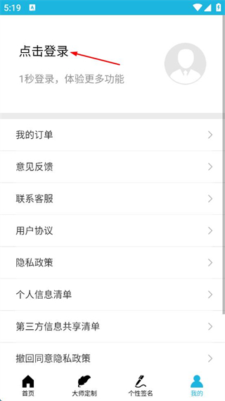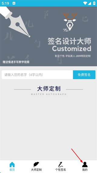 1、打開簽名設(shè)計大師APP,點擊右下角“我的”進入個人頁面。