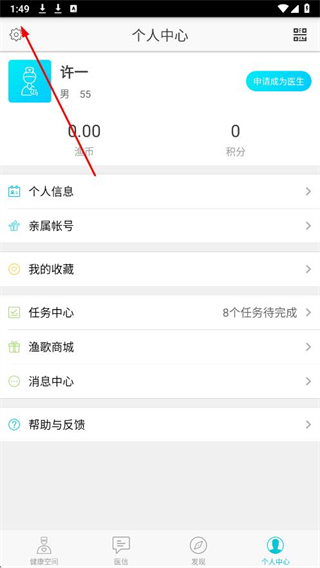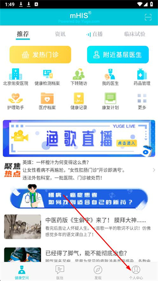 1、打開(kāi)漁歌醫(yī)療APP,點(diǎn)擊導(dǎo)航欄中的個(gè)人中心。
