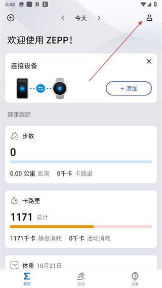 1、打開Zepp應(yīng)用,點擊首頁右上角的個人中心圖標(biāo)。