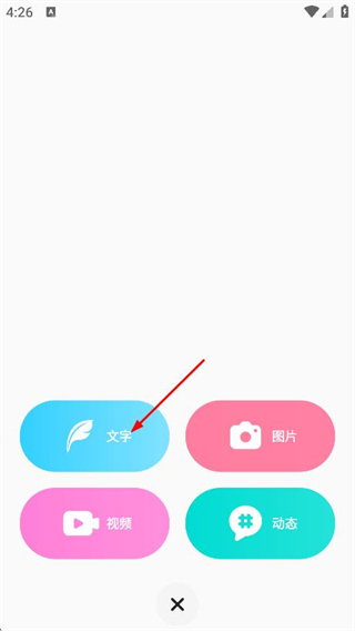 2、在彈出的發(fā)布選項中,點擊文字按鈕,進入文字編輯頁面。