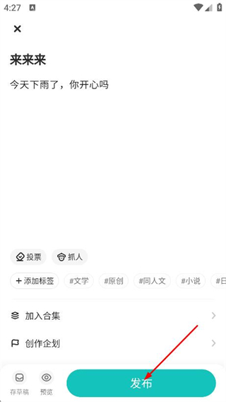 3、在文字編輯頁面中,輸入你想要發(fā)布的文字內(nèi)容,還能添加投票、抓人,添加標簽等,完成后點擊底部的發(fā)布按鈕。