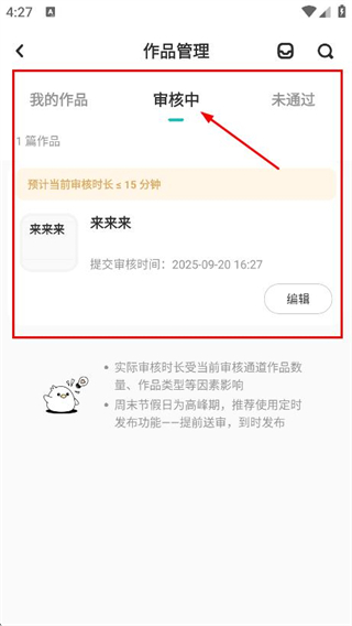 4、發(fā)布完成后,點擊我的,找到作品管理,點擊審核中欄目,即可查看發(fā)布作品的審核狀態(tài)。