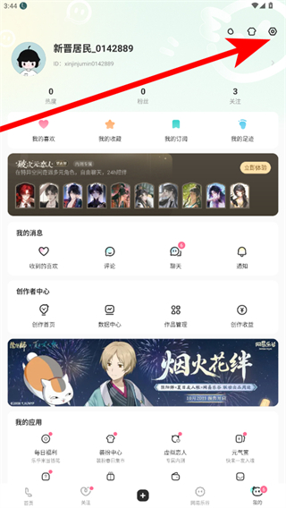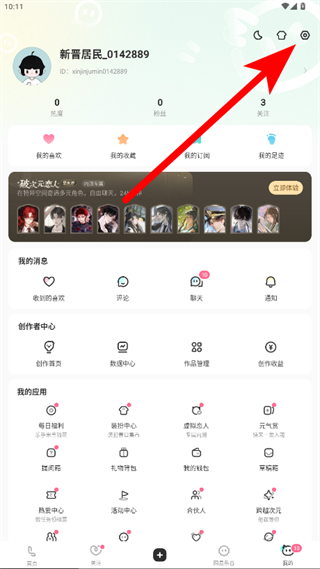 2、在個人頁面中點擊右上角設(shè)置圖標,進入設(shè)置頁面。