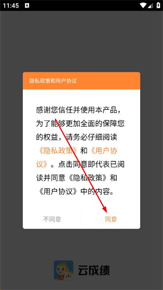 1、打開云成績app,在彈出的提示框中點(diǎn)擊同意。