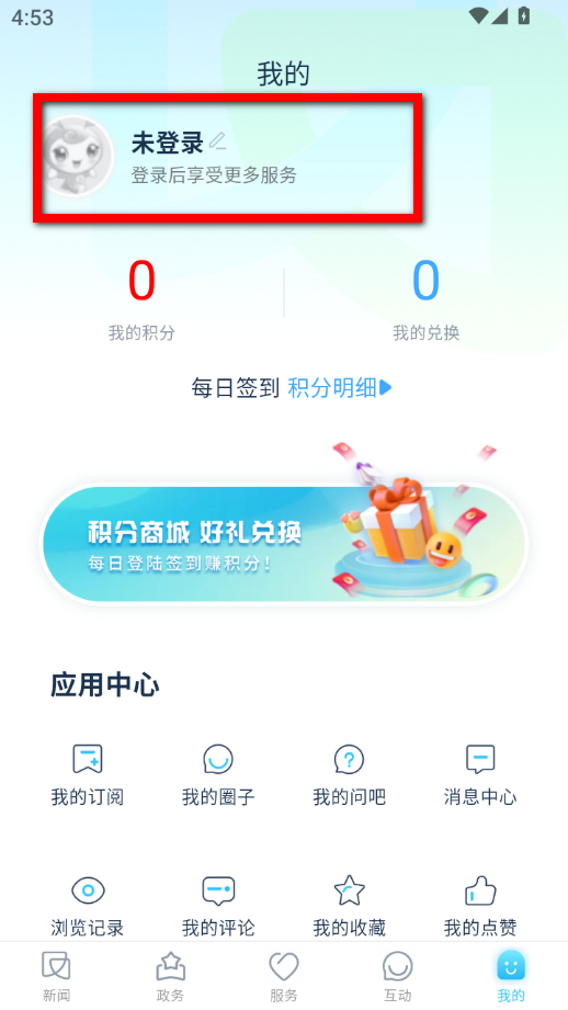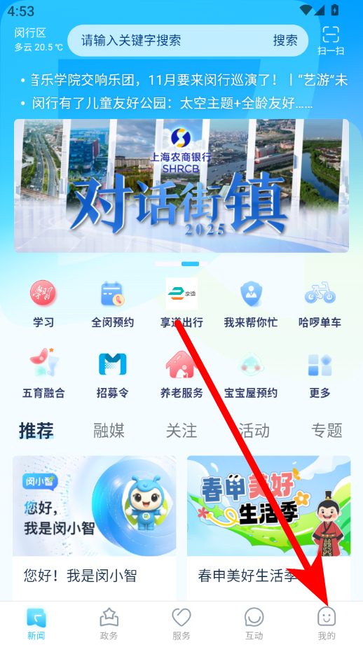 1、在今日閔行APP主頁面,點(diǎn)擊右下角我的選項(xiàng),進(jìn)入個(gè)人界面。