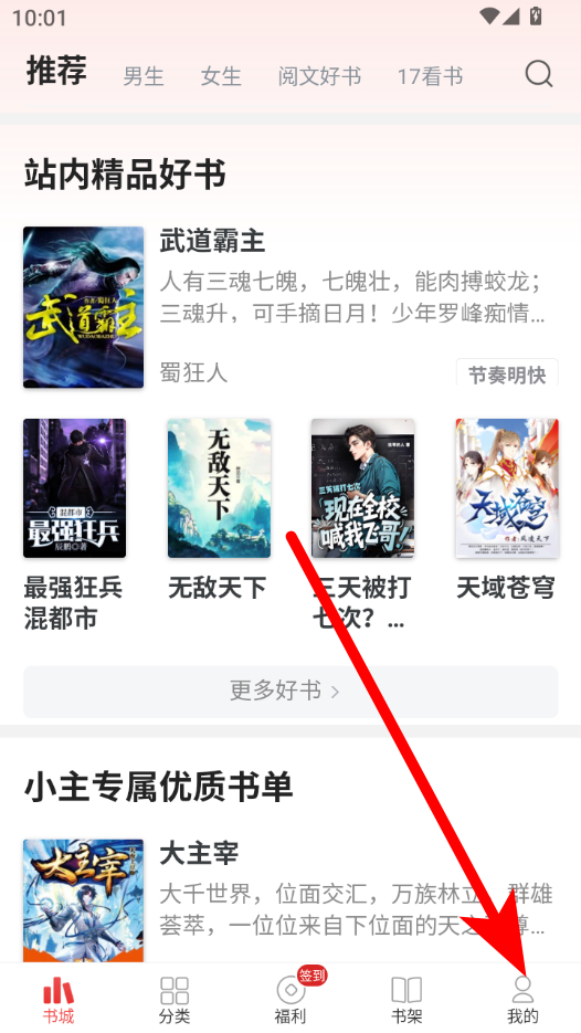 1、在追書神器書城頁面,點(diǎn)擊我的選項(xiàng),進(jìn)入個(gè)人中心頁面。