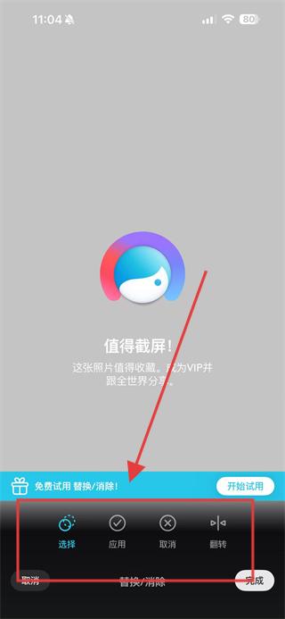 4、在彈出的替換/消除操作選項中,使用選擇功能圈選需要p掉的人物,接著點擊應用,即可嘗試將人物從圖片中去除,完成后點擊完成相關操作。